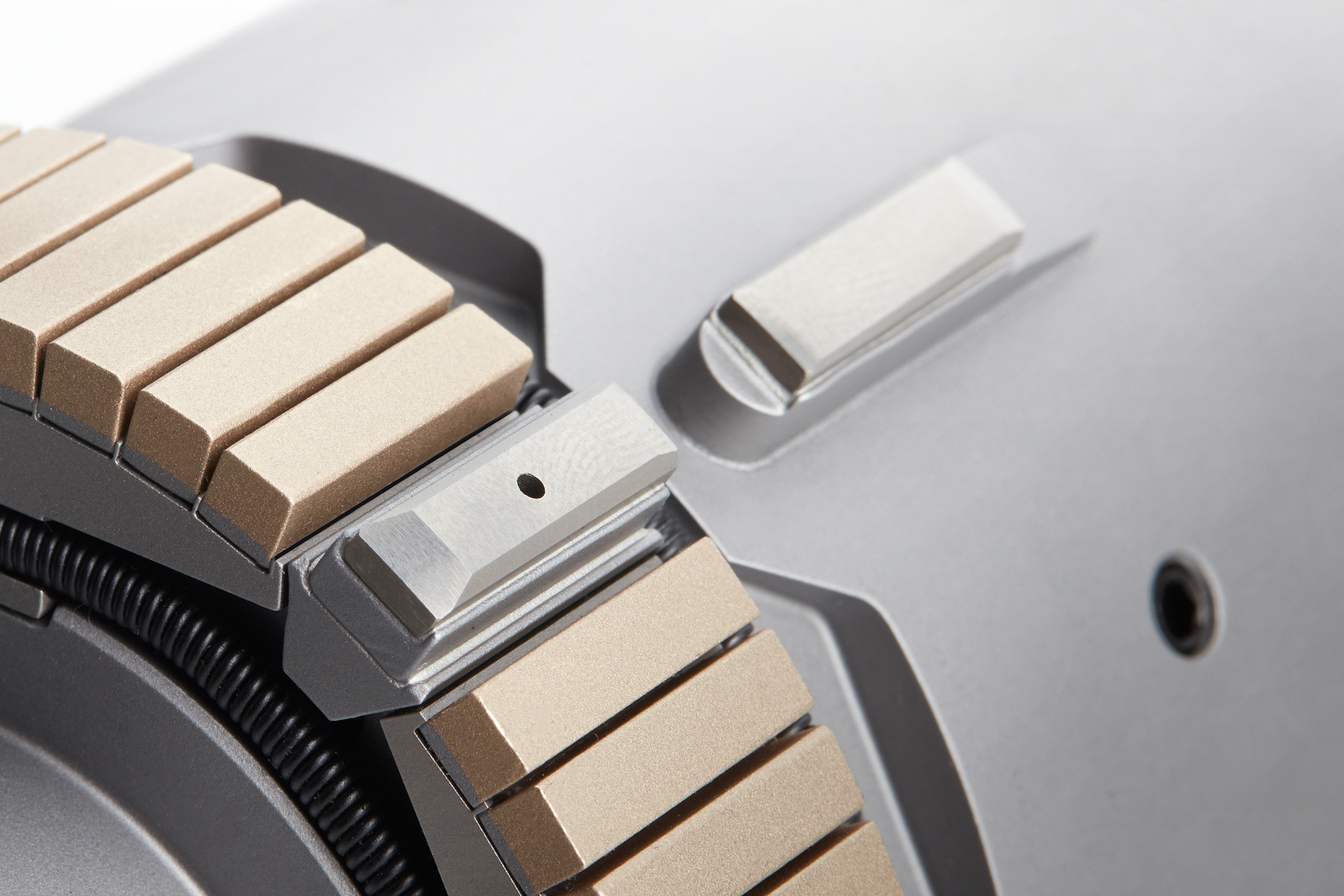 Die Gestaltung greift die technischen Anforderungen der Honbearbeitung konsequent auf: Die griffige Oberfläche im mittleren Bereich unterstützt den sicheren manuellen Zugriff, während das robuste Gehäuse aus Aluminium und Edelstahl Langlebigkeit und Stabilität gewährleistet.