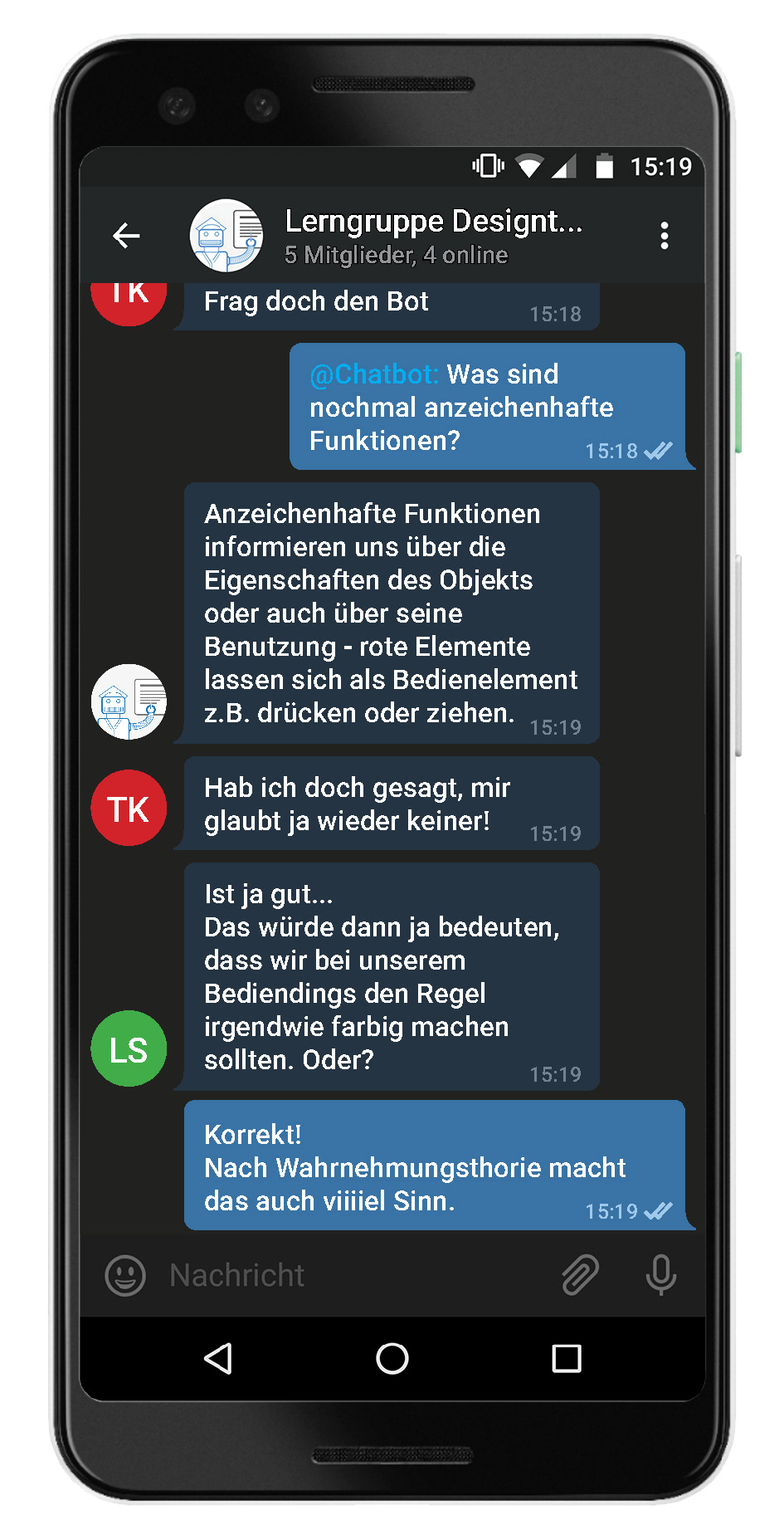 Das Konzept beinhaltet verschiedene Wissensbereiche, Audioverarbeitung, die Möglichkeit zum Human-Take-Over und andere Lernende mit in den Chat zu integrieren, etwa in Lerngruppen-Szenarien, die durch den Chatbot unterstützt werden.