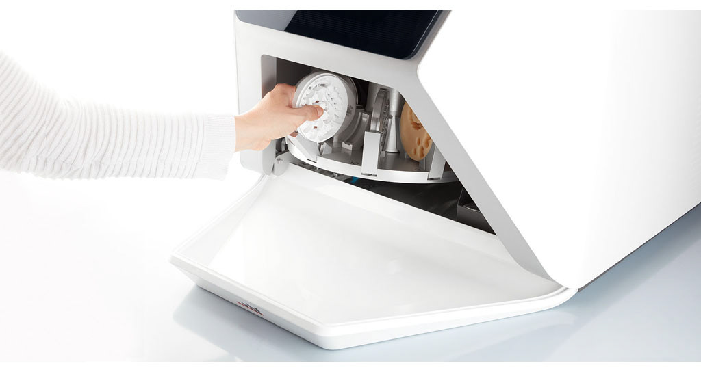 Funktionale Details wie der Zugang für Blanks und Werkzeuge im unteren Bereich und die ergonomisch optimierte Bedienhöhe zeigen, wie sehr Design und Technik hier zusammen gedacht wurden – für den anspruchsvollen Einsatz im dentalmedizinischen Umfeld.
